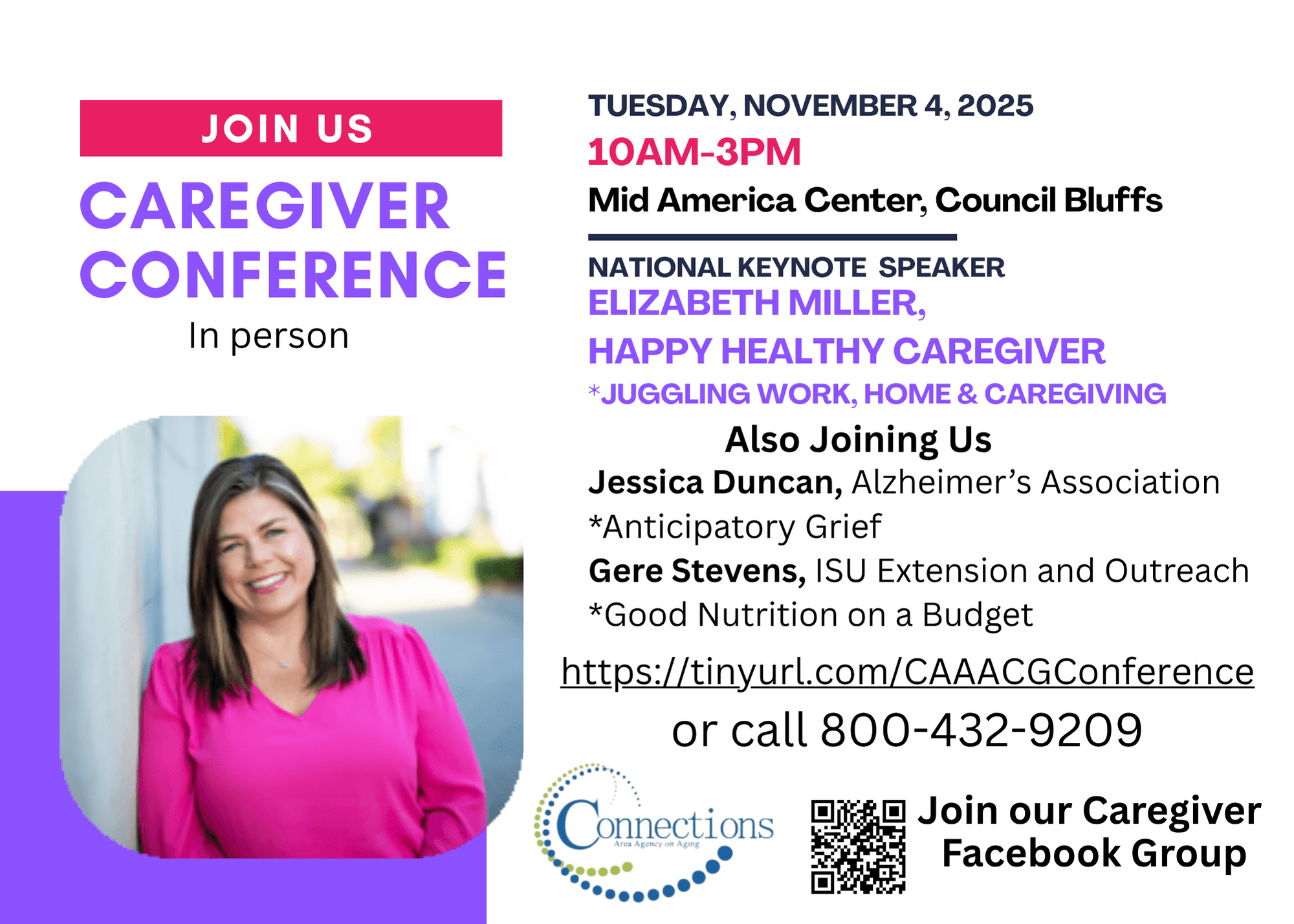 If you are a caregiver or have a question about our programs or the upcoming conference, please reach out to Tasha Jones at tjones@connectionsaaa.org or 800-432-9209 to visit more.