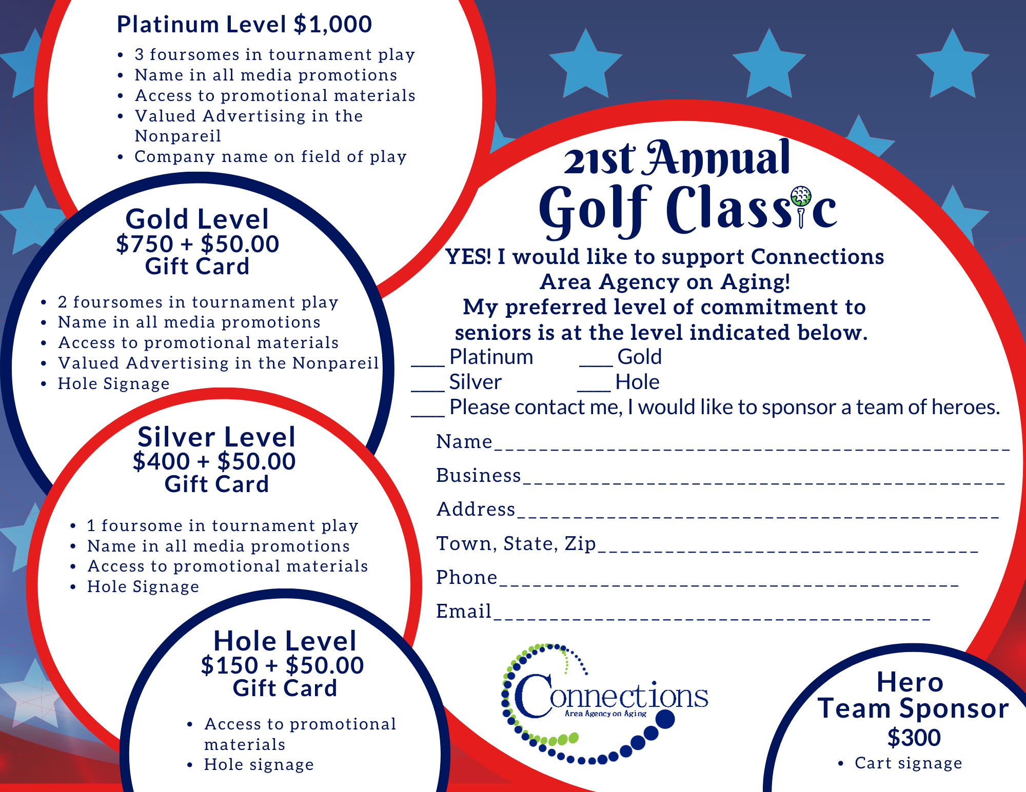 In recognition of the fiscal challenge posed by COVID-19, we are continuing our reduced sponsorship rates for this year, asking each bronze, silver, gold, and platinum sponsor to submit their registration and to please include a $50 gift card of your choice to be used as a pin prize for our players. This year’s levels are at the same reduced rates as last year: