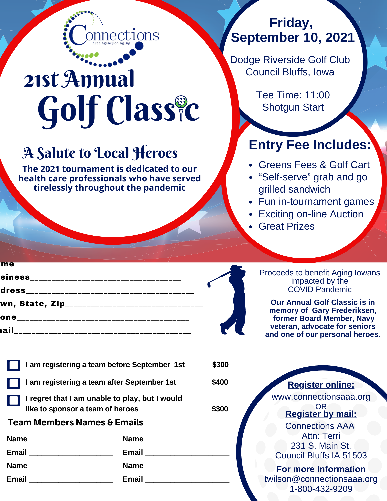 We are excited to open registration to players, teams and sponsors for our annual golf fundraiser for Connections! It’s been a year unlike any other, and we sincerely hope that you and your family have remained safe and healthy during this unprecedented pandemic. Like last year’s event, we will be taking extra precautions to ensure your safety during the tournament, once again held in honor of support for our local heroes. In addition to saluting our fire, police and rescue heroes, this year we will be honoring our public health officials who have been critical to vaccination efforts that are helping us see the light at the end of the pandemic tunnel. Please join us on Friday, September 10th at 11am for this year’s event. For safety precautions, we will be implementing the following: